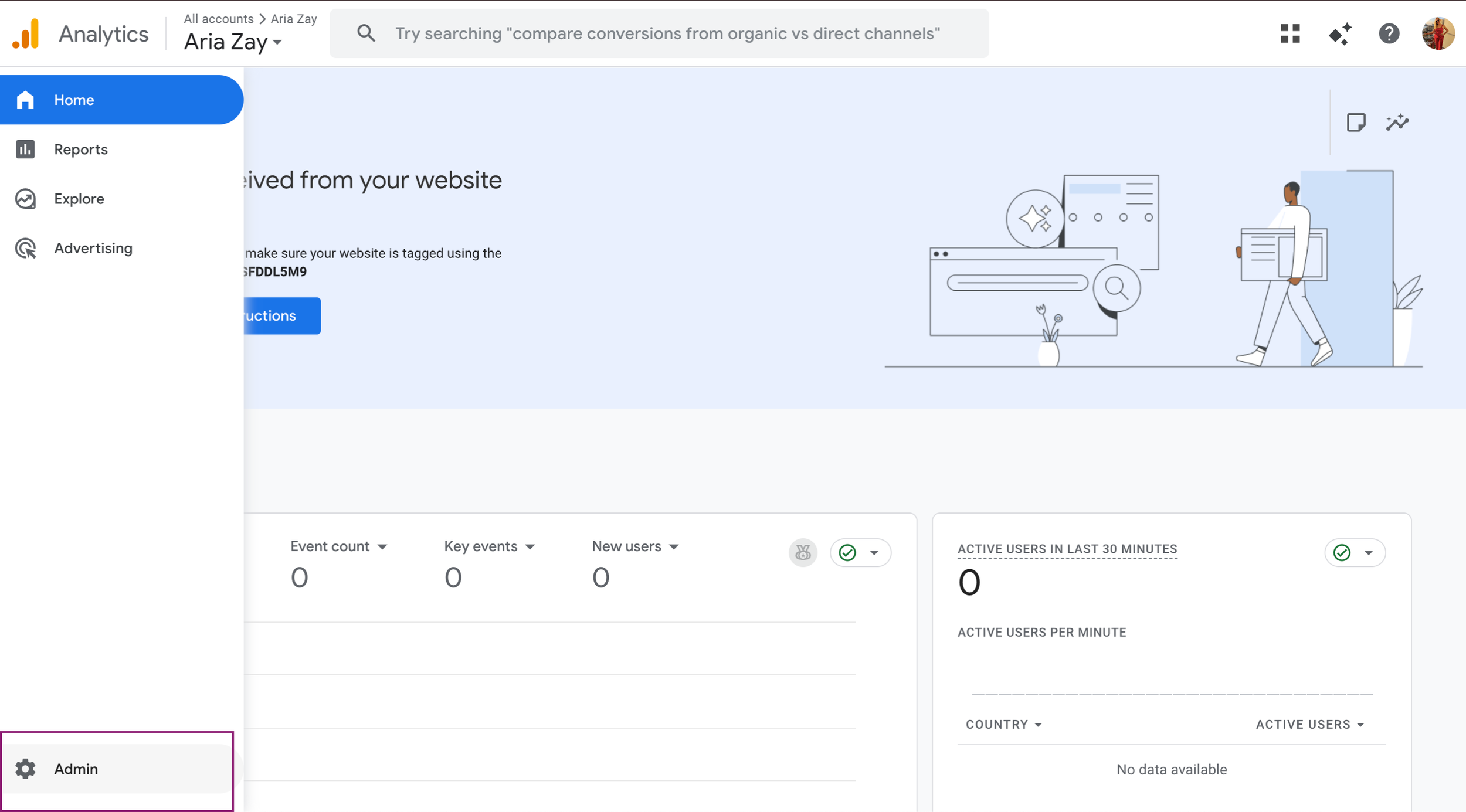 We’ll want to get into the Admin section of GA4, so on the left, you’ll hover over and it’ll open. At the bottom left choose the gear icon, it’ll say Admin.