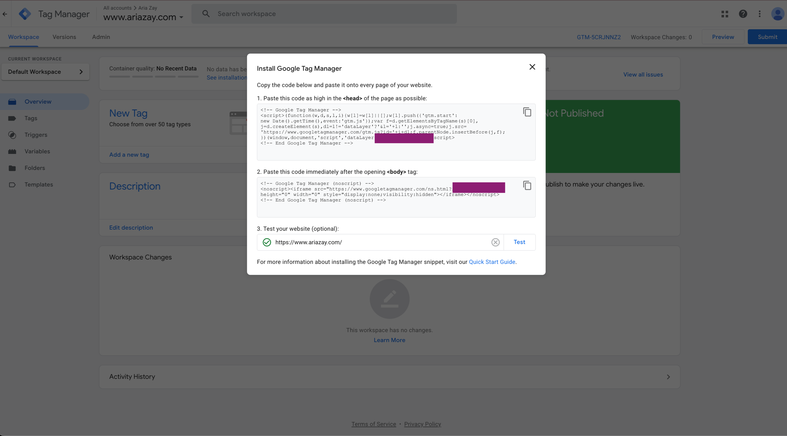 Save it on Squarespace, and then go back to Google Tag Manager and test the connection by entering your website url and selecting “test” You should get a green checkmark next to your url. This happened almost immediately for me, but, if it doesn’t work for you, give it a little bit of time and try again. If it still doesn’t work, verify that you saved the code injection inside of Squarespace.