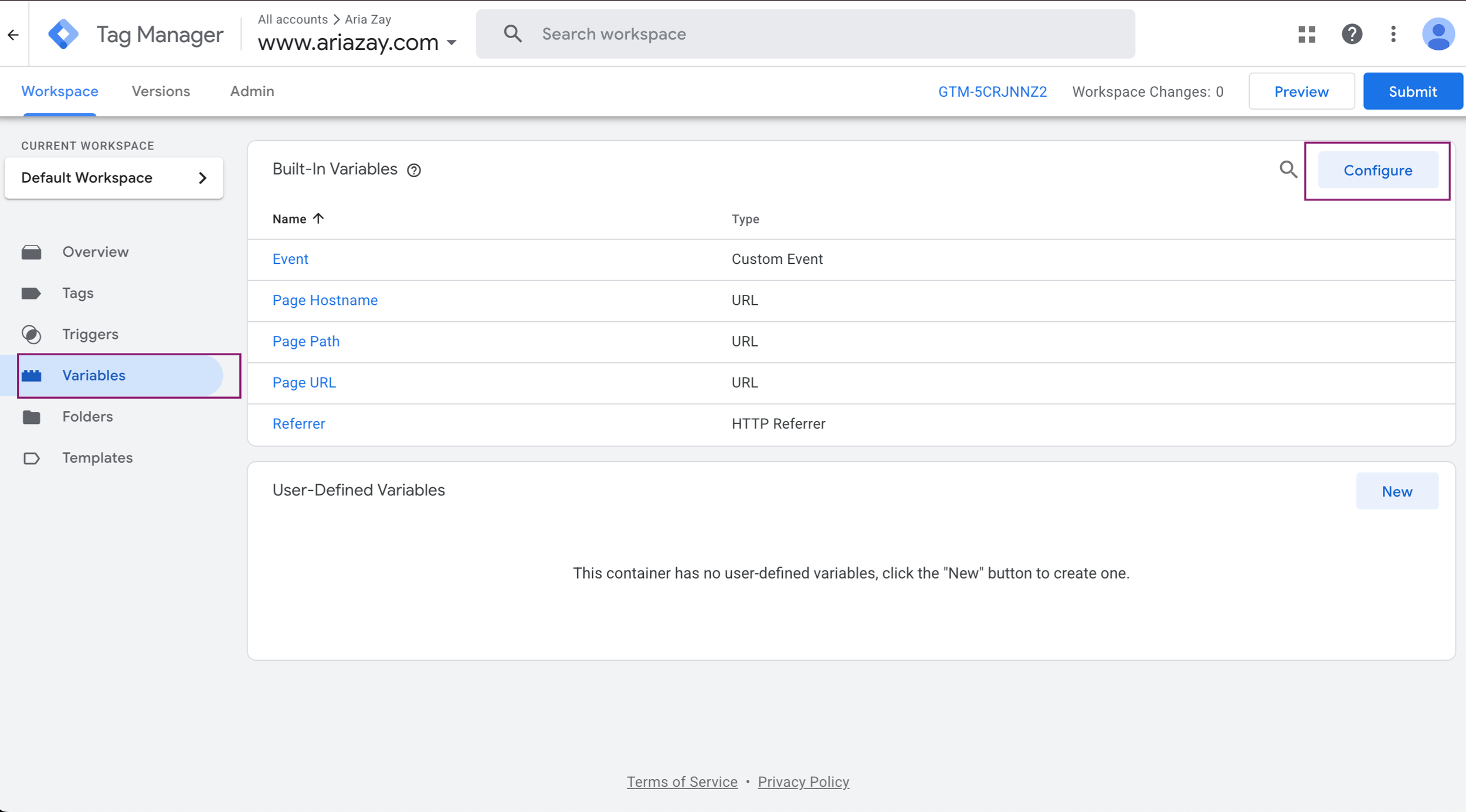 We’re now going to enable all variables. So, in the Workspace, choose “Variables” and then select “Configure”