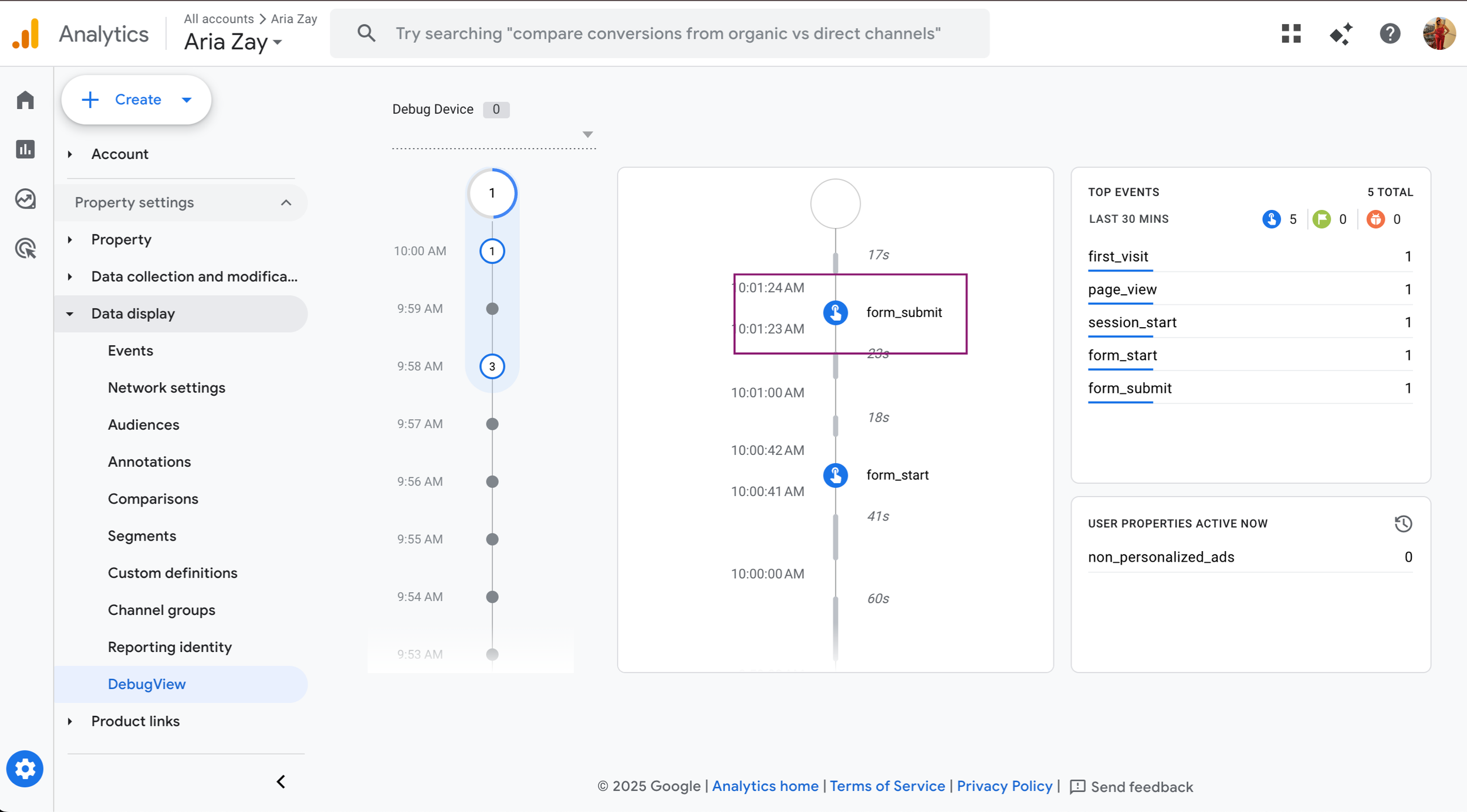 Once you hit Submit on your form, head back over to the GA4 Debug View. There is a delay, so give it some time to show up. However, if everything is set up properly you should see form_submit show up on the timeline.