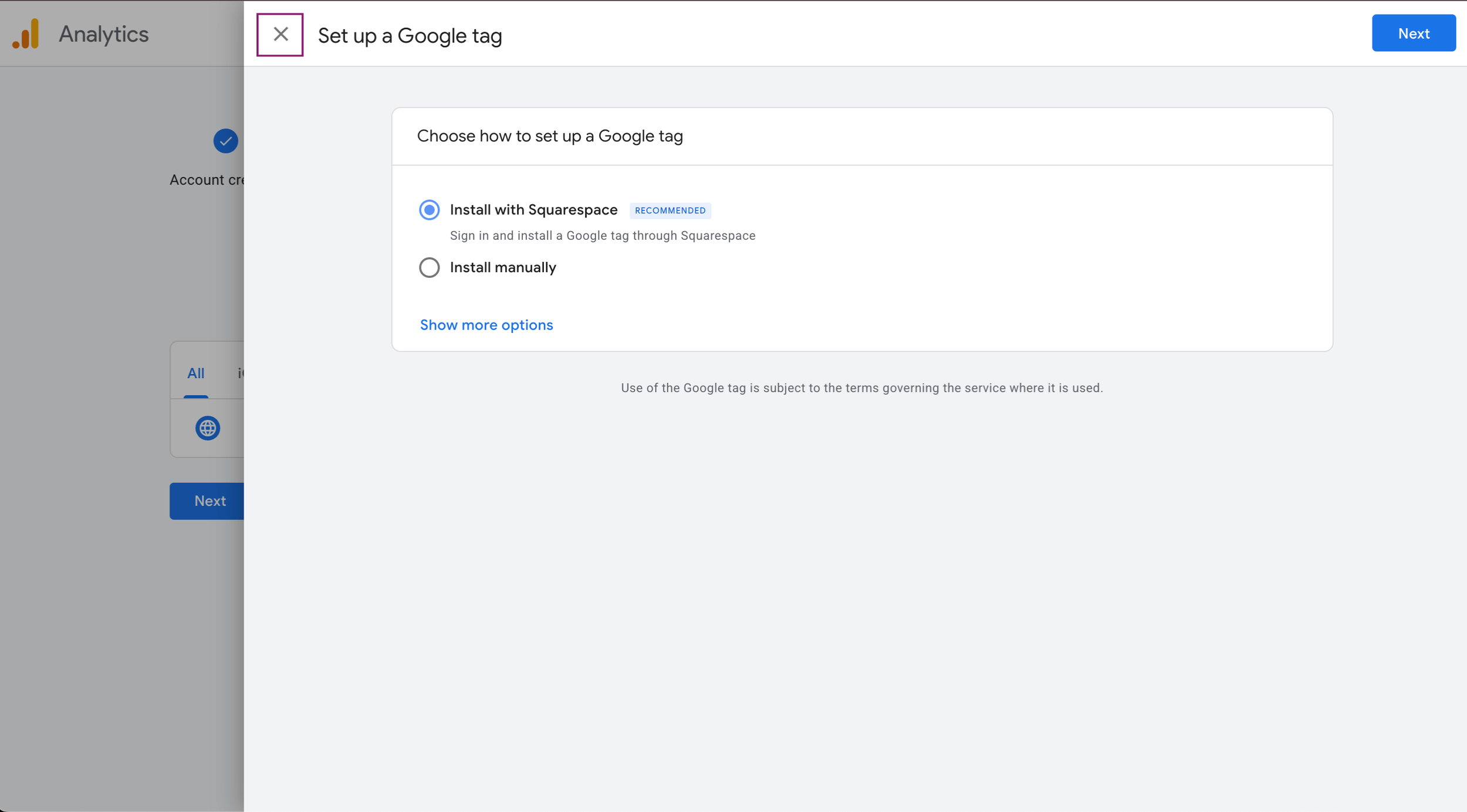 You’ll then have to Set up a Google Tag. While we do have Squarespace, this is not how we’ll be setting it up. We also aren’t going to follow the install manually, so just hit the X on this screen.